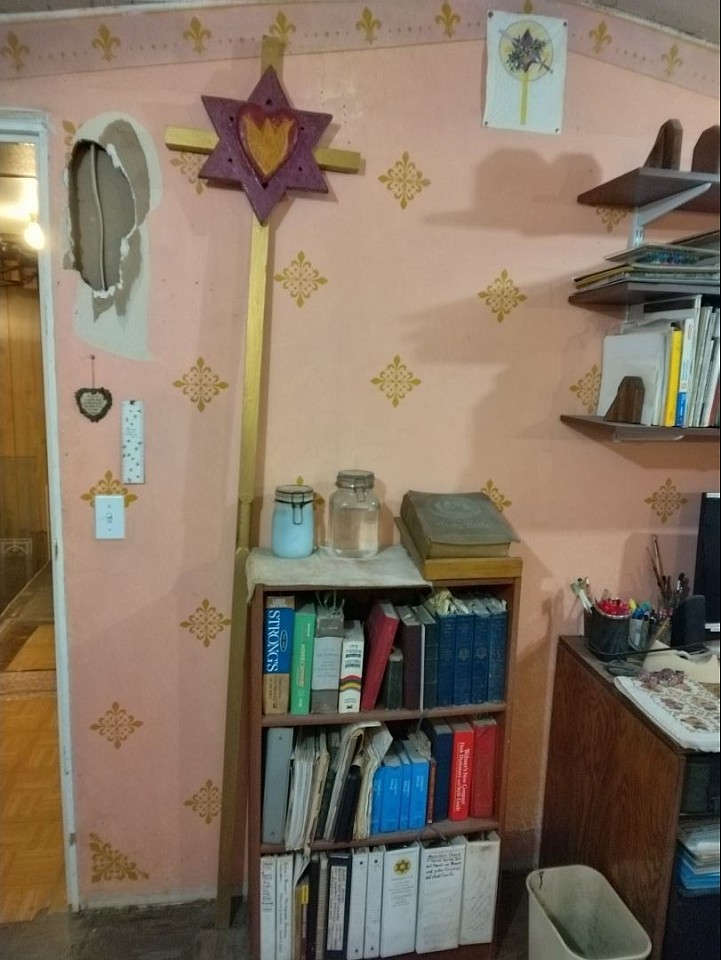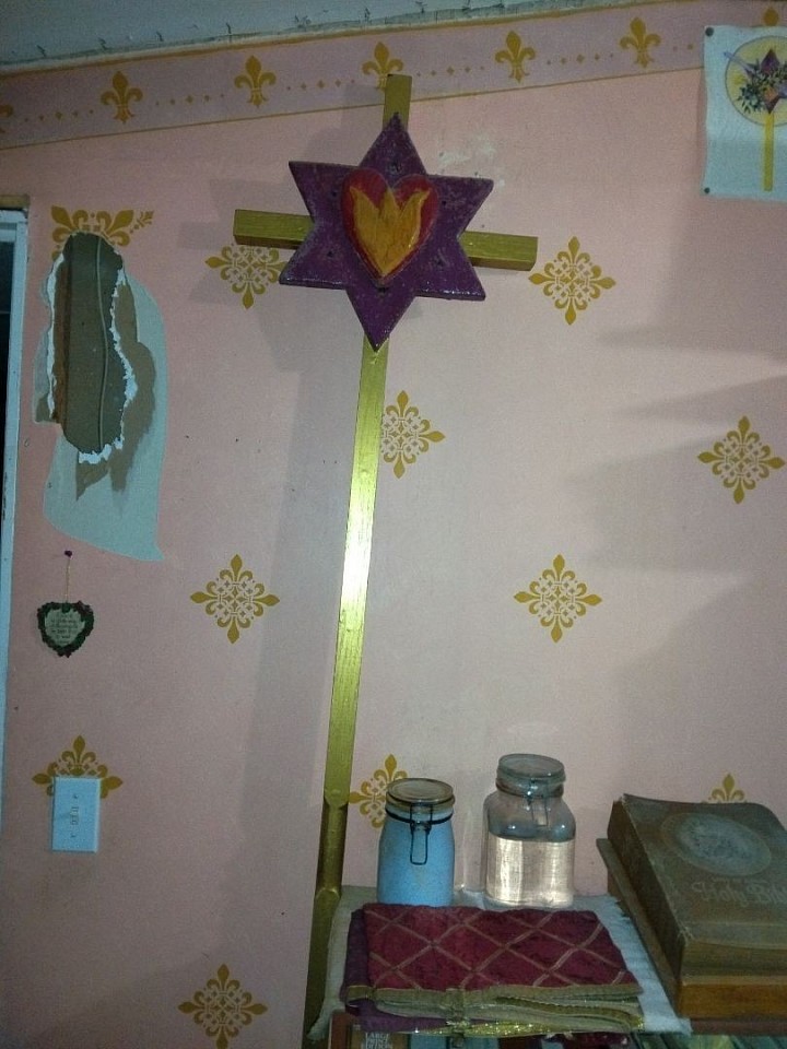 This is the Prayer Chapel and the Sacred Septer Cross™ of Divine Sacred Holiness Abstinent™, Divine Sacred Holiness Reverend™, Divine Sacred Holiness Father™, Divine Sacred Holy Justice™, Divine Sacred King Meshiah™ Alfred Charles Bruner™ in his Chambers. The Sacred Septer Cross™ is colored gold and has a royal purple Star of David centered on the front and a crimson red heart with a three point flame in the midst of it on the front of the heart©.